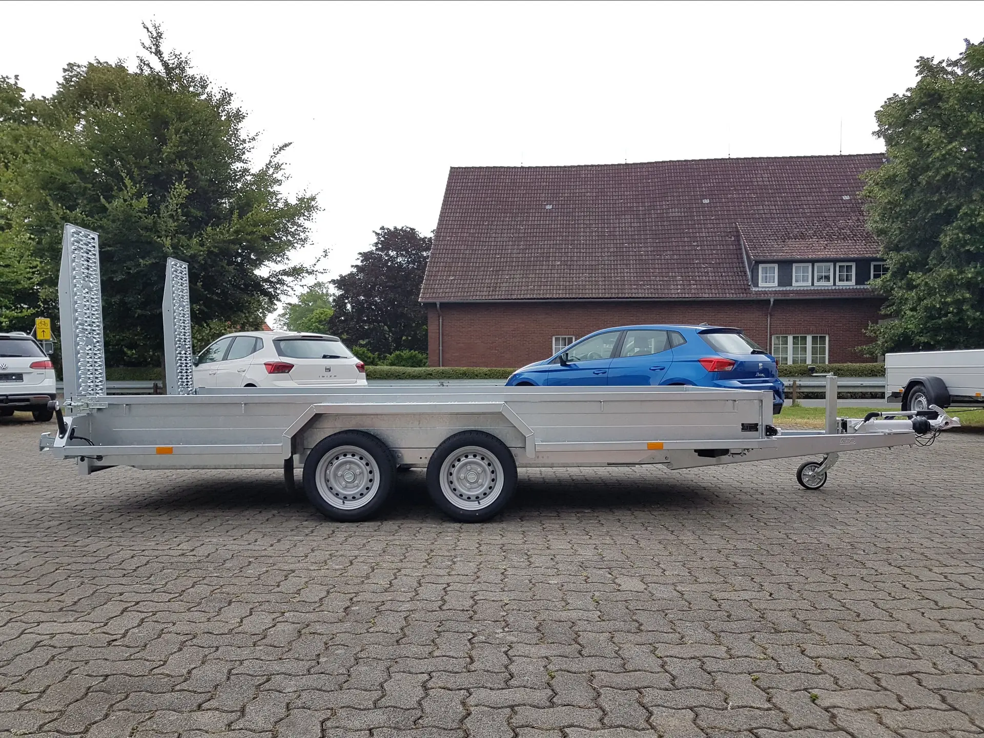 Zur Serienausstattung gehören einschiebbare Auffahrrampen mit Stützen, stabile Verzurrösen, ein V-Deichselrahmen, begehbare Kotflügel sowie ein Automatik-Stützrad. Achsen und Bremssysteme stammen von renommierten Herstellern wie AL-KO oder Knott.