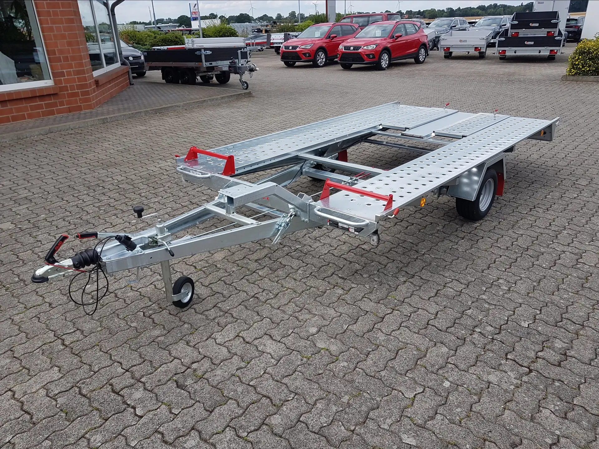 Das geschweißte und vollständig verzinkte Fahrgestell bietet optimalen Korrosionsschutz und hohe Stabilität. Dank der Kippfunktion durch Gewichtsverlagerung wird das Be- und Entladen deutlich erleichtert – besonders bei tiefergelegten Fahrzeugen.