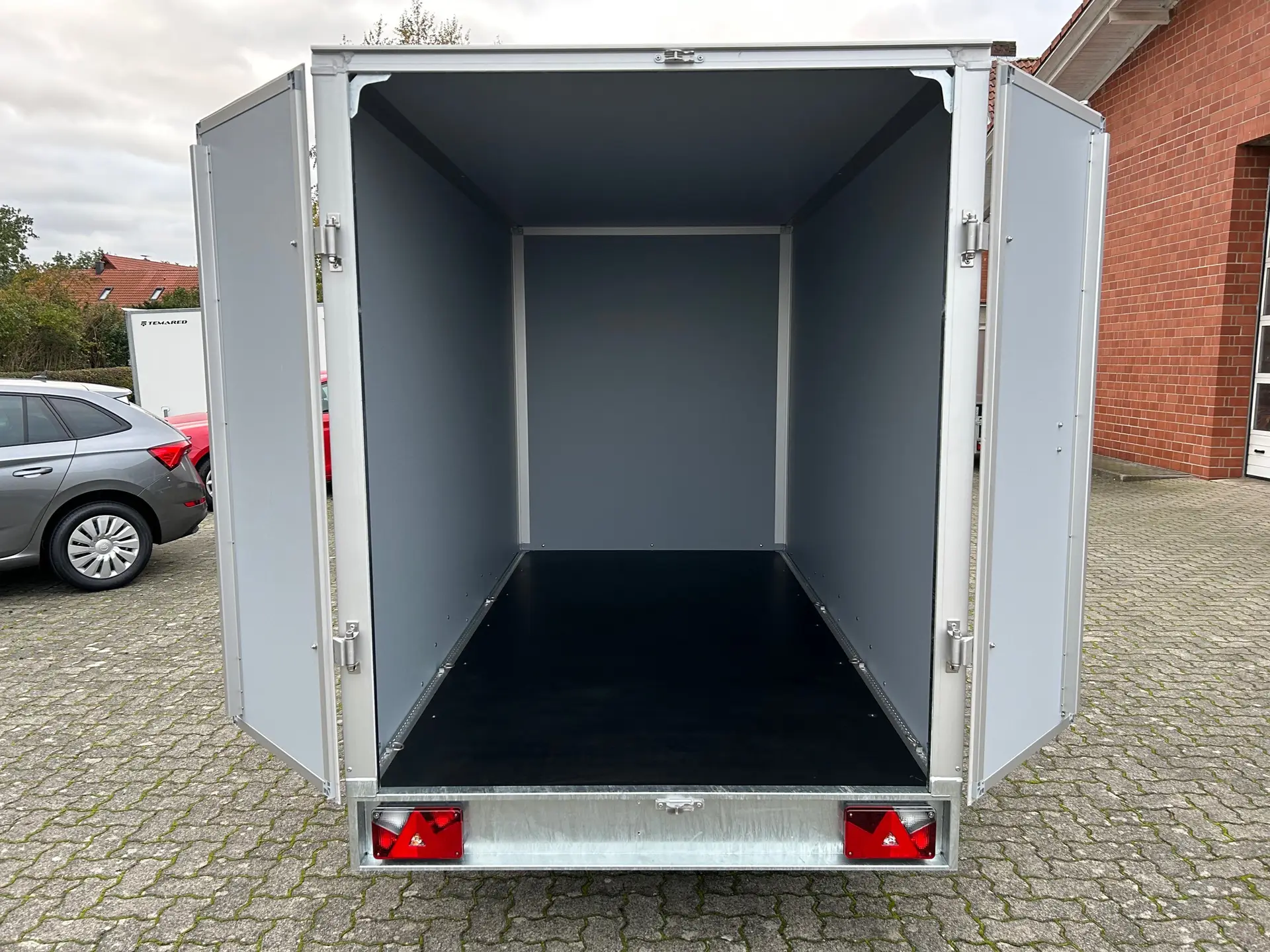 Außen in Weiß, innen in Grau – pflegeleicht und professionell. Optional erhältlich: Seiten- oder Hecktür, Auffahrrampe statt Hecktüren, Stoßdämpfer (100 km/h Zulassung), Zurrschienen mit Sperrbalken, Ersatzrad, Anhängerschloss, Voll-LED-Beleuchtung.