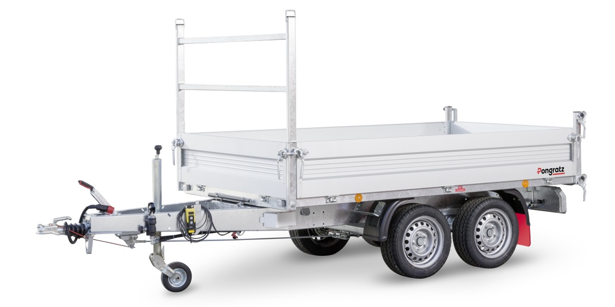 Der Anhänger 3-SKS 3100/17 T (zulässiges Gesamtgewicht 3500 kg) wurde für den professionellen Einsatz entwickelt. Mit einer Nutzlast von 2518 kg, einem verwindungssteifen Stahlrahmen und einer elektrischen Hydraulikpumpe bietet er maximale Zuverlässigkeit im täglichen Einsatz.
